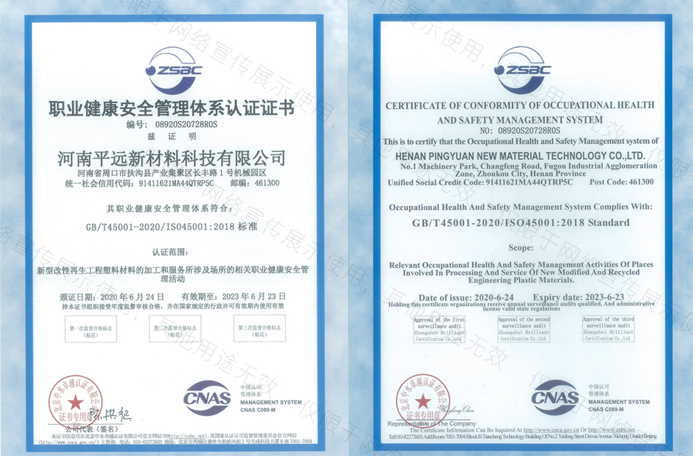 河南平遠新材料科技有限公司生產基地坐落于河南省鄢陵縣先進制造業開發區,工廠占地10000平方米。公司通過GRS全球回收標準認證、ISO9001質量體系、14001環境體系和45001職業健康安全管理體認證。華東分公司位于浙江省余姚市中國塑料城。